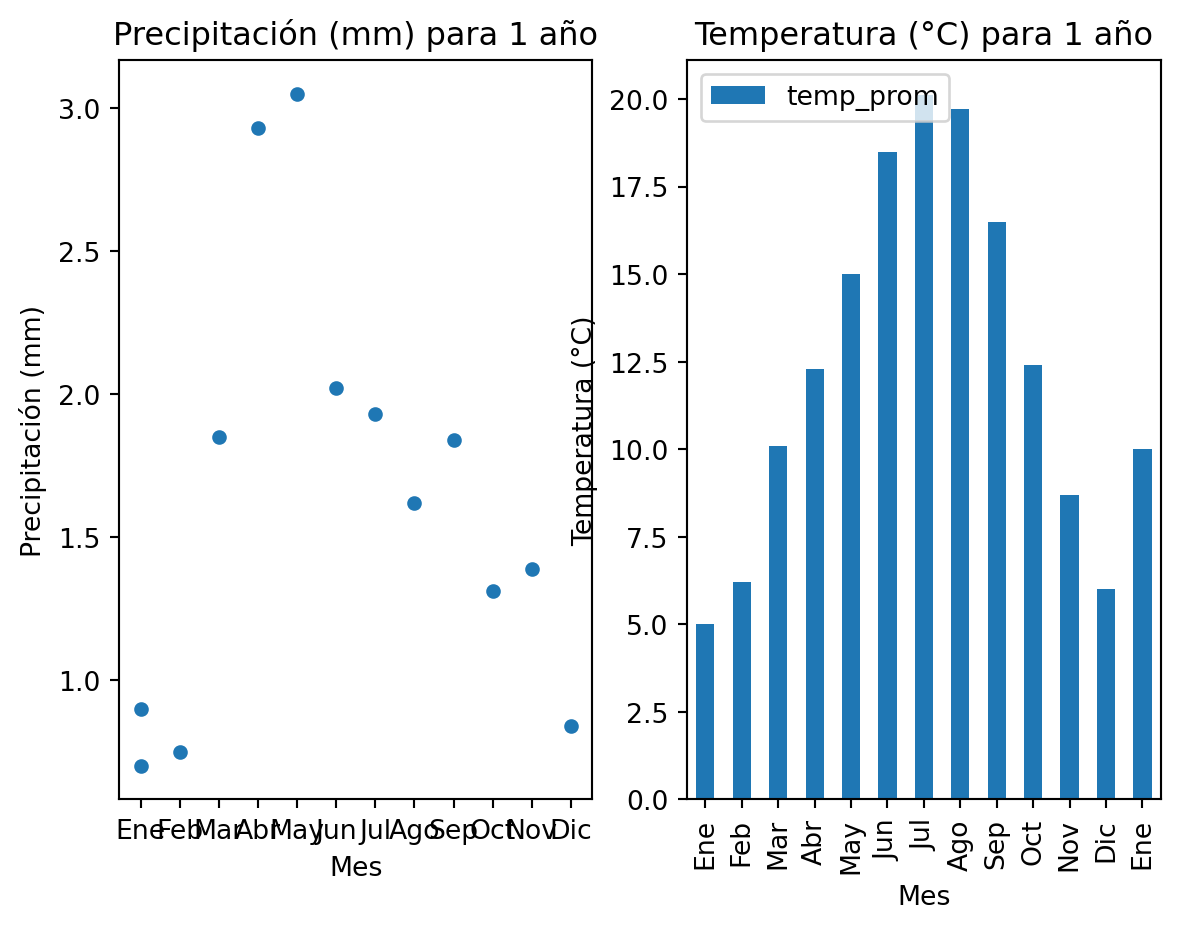 En este otro ejemplo, graficamos las precipitaciones como puntos y las temperaturas como barras usando el DataFrame precip_prom_mens:
