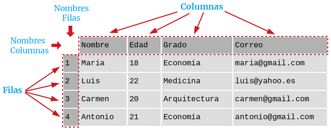 La estructura de un DataFrame se ejemplifica en la siguiente imagen: